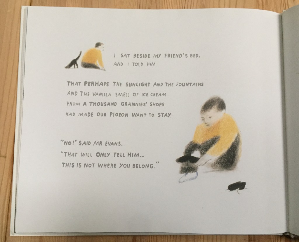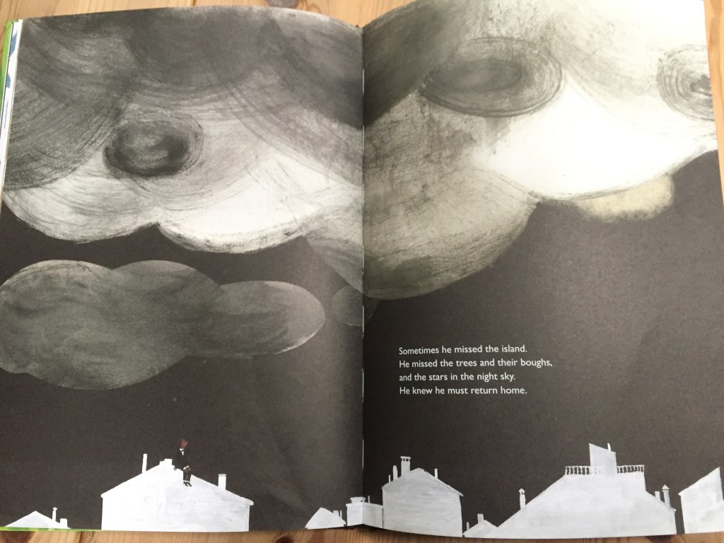 The child narrator has moved from Italy’s ‘sunlight, fountains and the vanilla smell of ice cream from my granny’s shop.’ to a town where, ‘It rained and rained and rained. Little houses huddled on the humpbacked hills. Chimneys smoked and metal towers clanked. The streets smelled of mutton soup and coal dust and no one spoke my language.’ Nicola Davies’ words are rich in feeling and perfectly complemented by Laura Carlin’s illustrations.