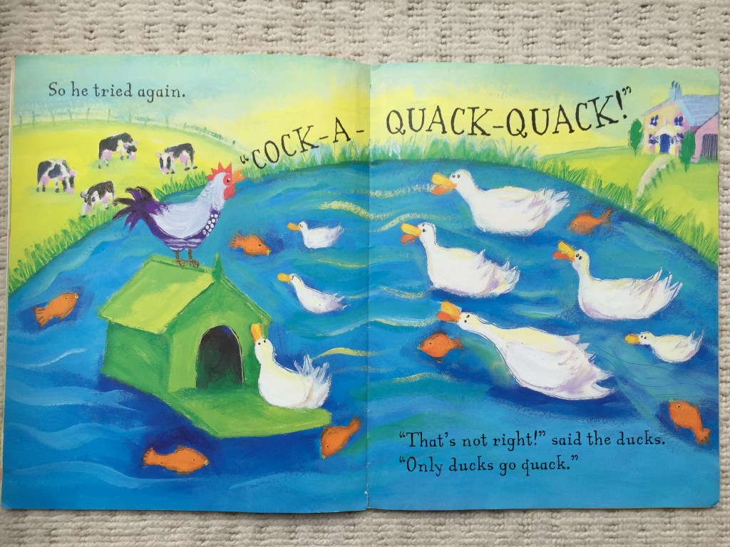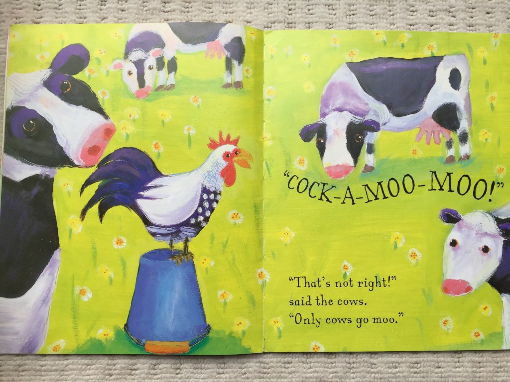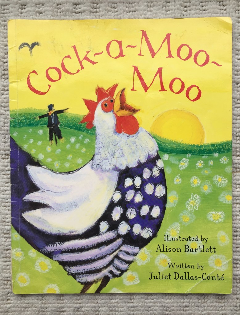 About 15 years ago, one of my children was given Juliet Dallas-Conté and Alison Bartlett’s ‘Cock-a-Moo-Moo’ as a birthday present. It was well-chosen by a friend and fellow primary school teacher (who now teaches at Ledbury Primary School). When my children grew up, I added it to my picture book collection and it continues to be one of my favourites.