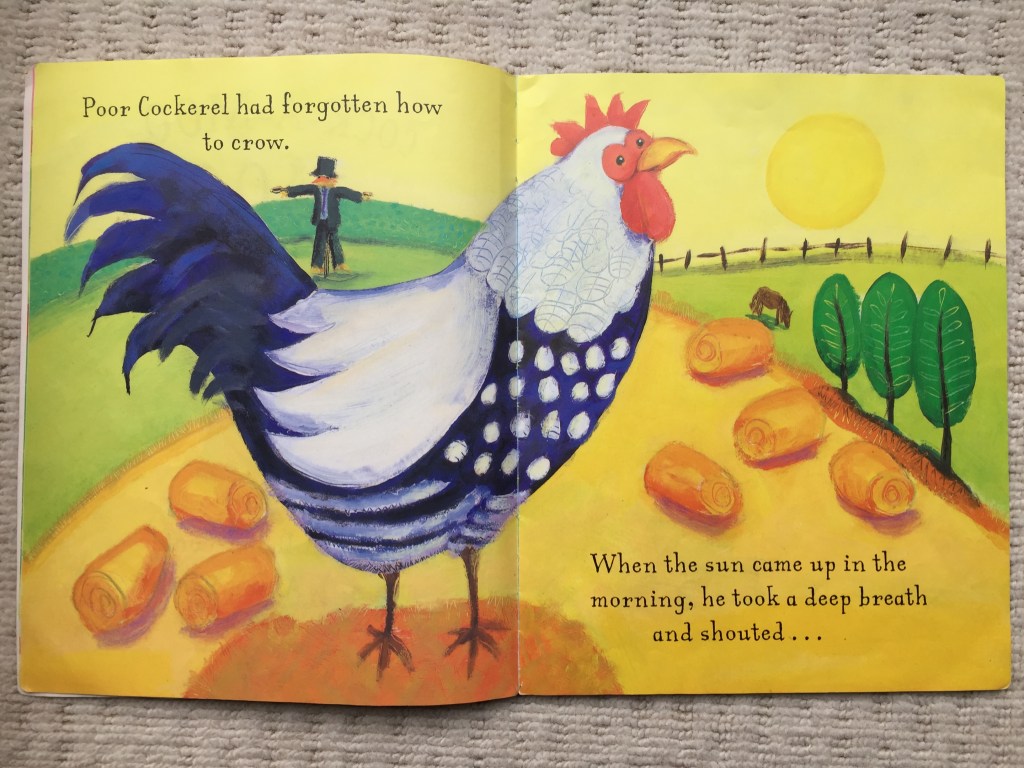 Yesterday afternoon I read it to a group of 0-5 year olds and their grown-ups at Ledbury Children’s Centre’s Storytime. The first page introduces a poor, forgetful cockerel – with whom I can relate…