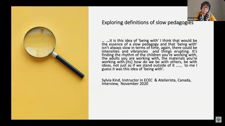 “…it is this idea of ‘being with’, I think that would be the essence of a slow pedagogy and that ‘being with’ isn’t always slow in terms of time, again, there could be intensities and vibrancies and things erupting.