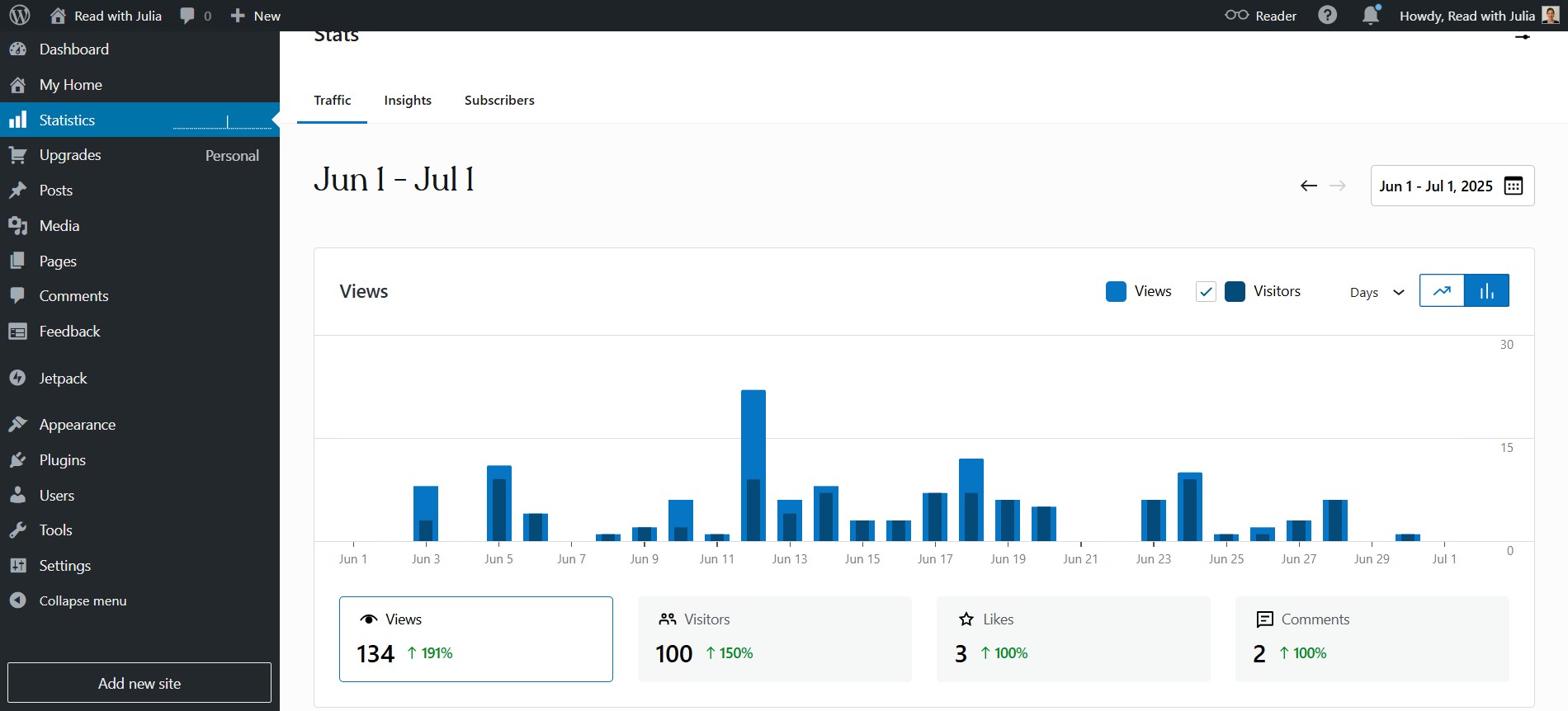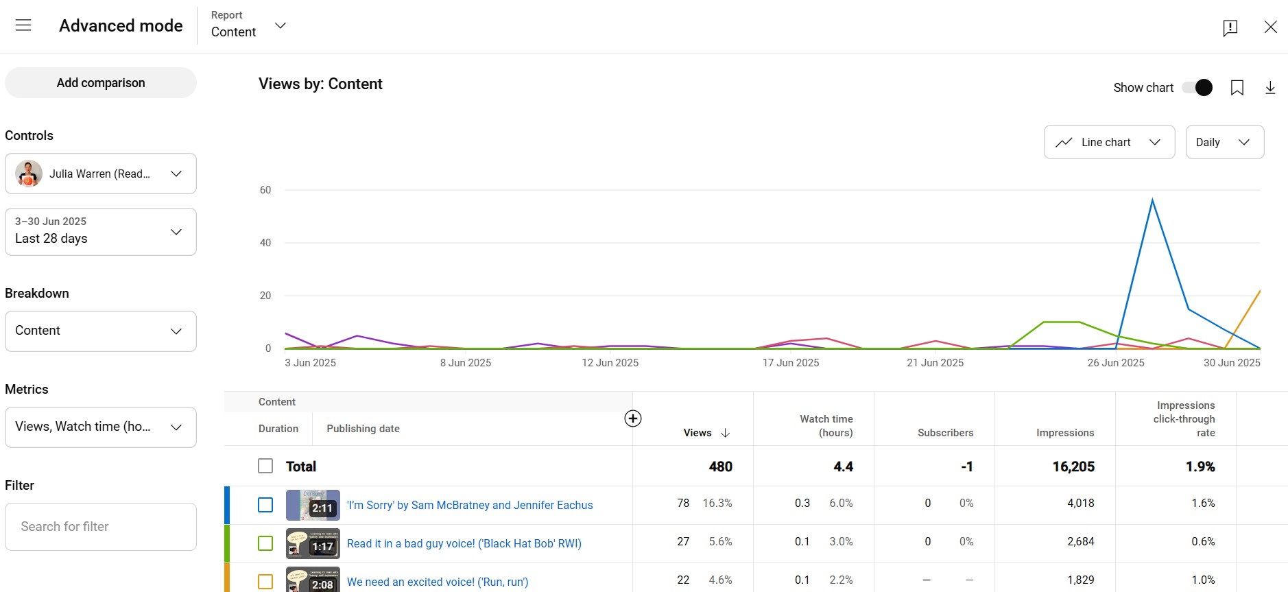 In terms of reaching my target audience, there’s room for growth – and promotion (come on, Julia, ‘Be Bold, Be Strong…’). Here’s a screenshot showing engagement for my channel and website last month: