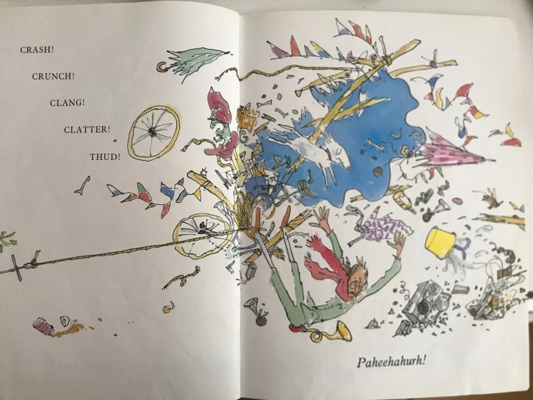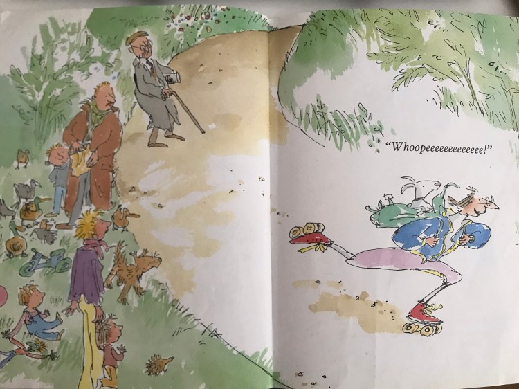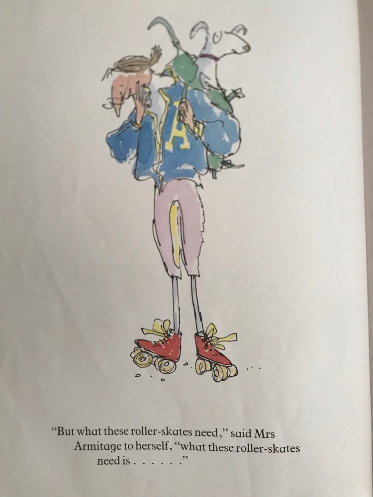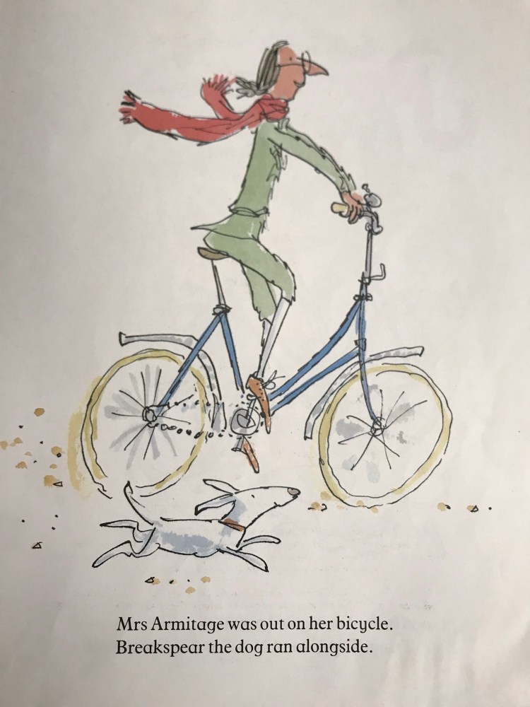 Quentin Blake’s story begins with Mrs Armitage and her faithful dog, Breakspear, enjoying a breath of fresh air and some exercise.
