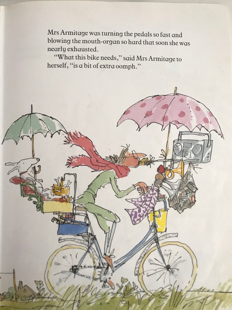 Mrs Armitage has a lively, inquiring mind and, as she cycles along, her thinking clicks into multiple gears (pardon the pun). She adds various paraphernalia to her bike, but still finds it lacking in the ‘oomph’ department.